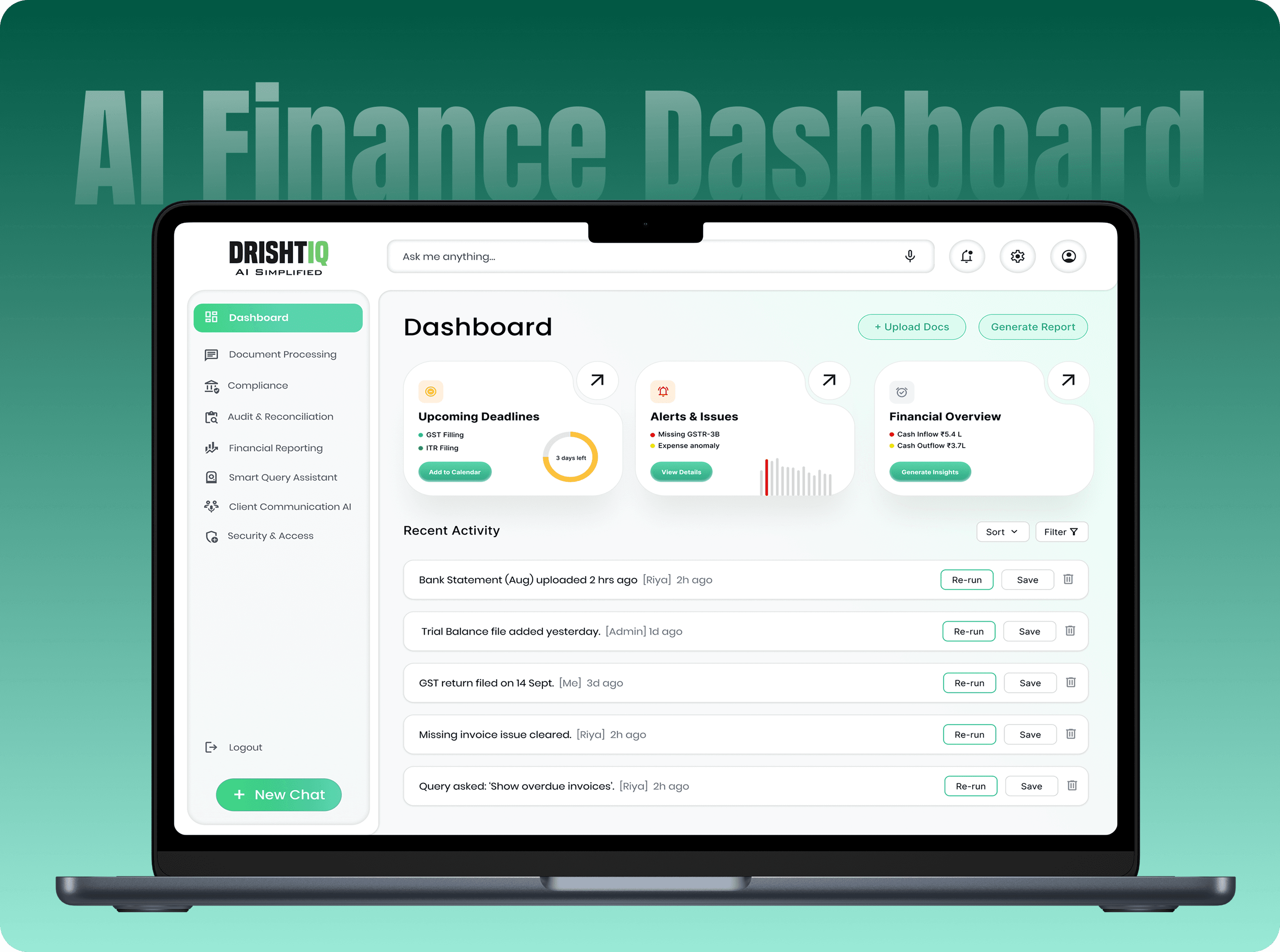 Designed an AI-driven finance dashboard to simplify document processing, compliance tracking, audit reconciliation, reporting, and client communication through clean, scalable UX.